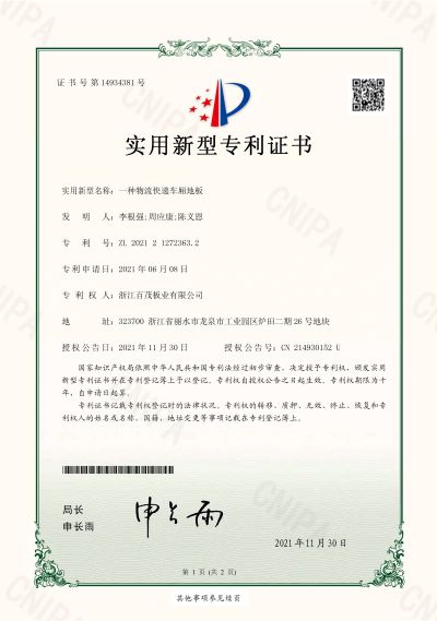 一種物流快遞車廂地板實用新型專利證書